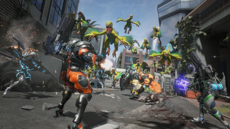 As an omnipresent robotic voice condescendingly wishes my team luck, my eyes widen in disbelief as a massive portal materializes over a city block. It spews hundreds of raptors that rain from the sky, tumbling down buildings before they sprint in our direction. It’s a jaw-dropping sight, but that awe turns to intimidation at the staggering number of adversaries thirsty for our blood. Our tank units move forward and activate their shields to create a defensive wall. A healer fills health bars to the brim. A sniper takes point on an elevated perch. All the while, my finger rests on the trigger of my grenade launcher, waiting to see the whites of my scaly enemies’ eyes before unleashing hell.